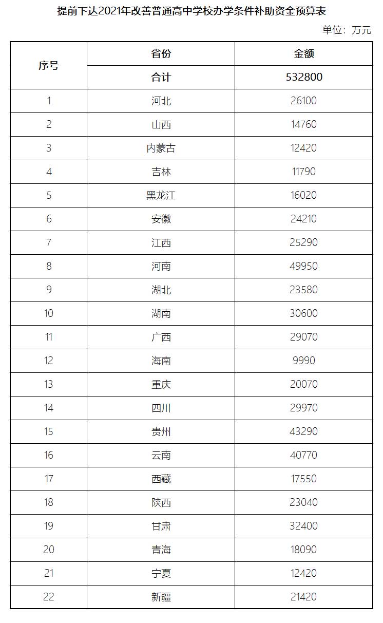 附件:提前下达2021年改善普通高中学校办学条件补助资金预算表
