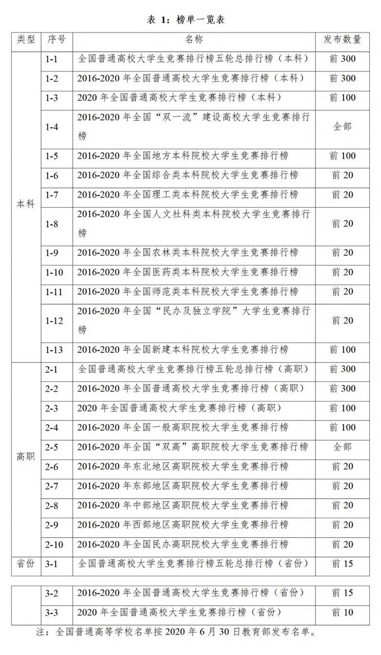 2021年3月22日,中国高等教育学会高校竞赛评估与管理体系研究工作组发布2020全国普通高校大学生竞赛排行榜,其中包含本科院校榜单13个、高职院校榜单10个、省份榜单3个(详见表1)。