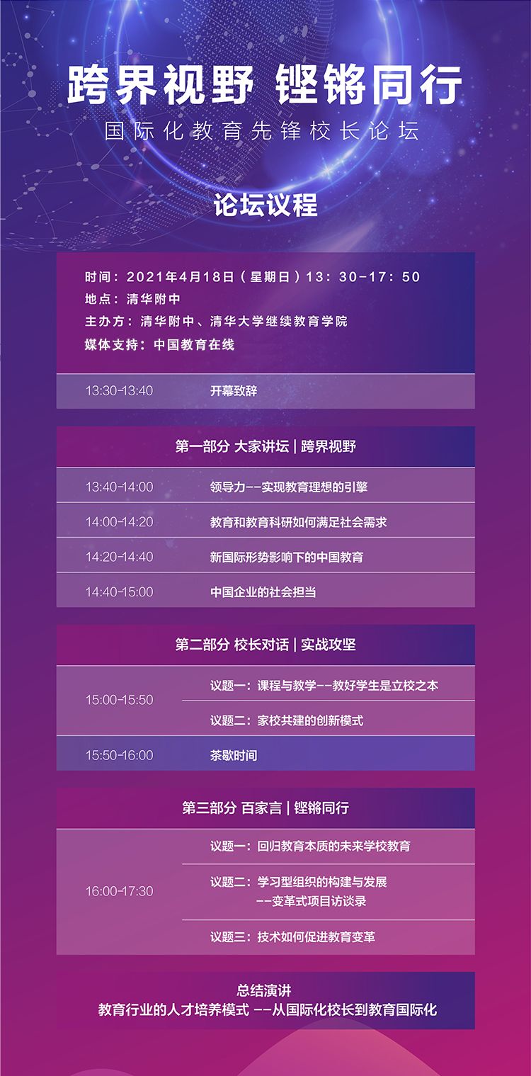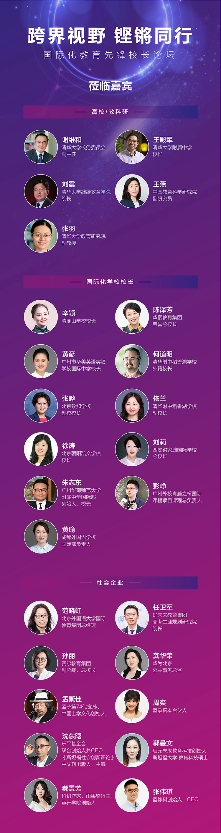 如何实现“扎根中国,比肩世界”,“贯穿领域,跨界融合”,“构建科学的教育体系”,是校长们应该深入思考的问题。为此,清华附中与清华大学继续教育学院将联合主办“跨界视野,铿锵同行—国际化教育校长先锋论坛”,让专家学者、资深和新锐校长汇聚一堂,共同探讨面向未来的教育创新方向。