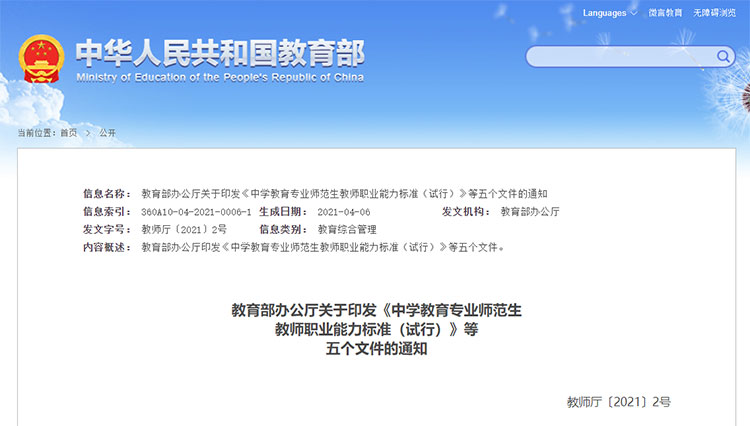 近日,教育部印发了《中学教育专业师范生教师职业能力标准(试行)》等五个文件(以下简称《能力标准》)。旨在进一步加强师范类专业建设,建立师范生教育教学能力考核制度,推动教师教育院校将国家中小学教师资格考试标准和大纲融入到日常教学、学业考试和相关培训中,提高师范类专业人才培养质量,从源头上提升教师队伍教书育人的能力水平。