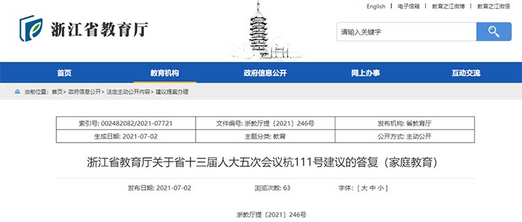 浙江省教育厅指出,家庭教育作为国民教育的重要组成部分,其教育质量直接影响到全民族素质和社会进步程度。近年来,浙江省高度重视家庭教育工作,于2020年1月1日出台了《浙江省家庭教育促进条例》,形成了妇联、教育等部门合力主抓,多部门联合协作,社会力量共同参与的家庭教育工作机制。近年来,浙江省以网上浙江家长学校建设为重点,家校协同育人在省级层面走在了全国前列。