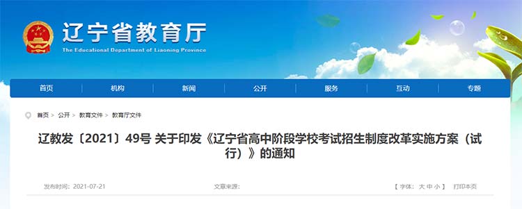 7月21日,辽宁省教育厅下发了《辽宁省高中阶段学校考试招生制度改革实施方案(试行)》,明确辽宁省中考改革从2021年秋季入学的七年级(初一)学生开始执行。