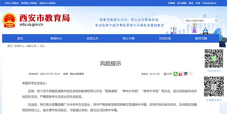 西安市教育局发布风险提示:个别教育机构违规宣传或非法招生