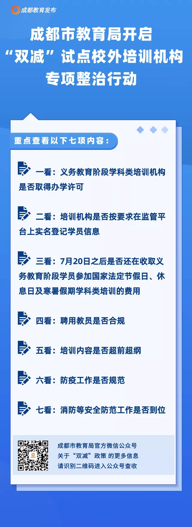 8月初至12月底,市教育局组织专门力量,成立成都市校外培训机构治理“回头看”工作组。同时,邀请人大代表、政协委员、市民代表及新闻媒体记者等担任“观察员”,对培训机构治理实施社会监督。工作组将采用“四不两直”(不发通知、不打招呼、不听汇报、不用陪同、直奔基层、直插现场)方式明查暗访培训机构,重点查看七项内容: