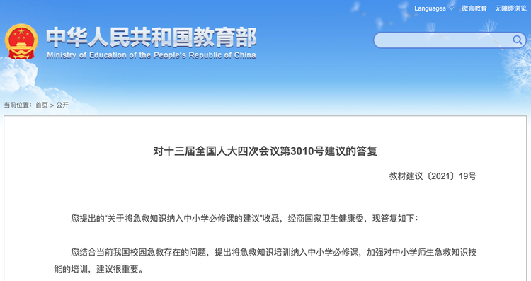 近日,教育部网站公布对“关于将急救知识纳入中小学必修课的建议”的答复。答复中称,教育部将会同国家卫生健康委、红十字会等部门,深入推动各地、各学校应急知识和急救技能教育培训,提升师生安全意识,提高急救技能。