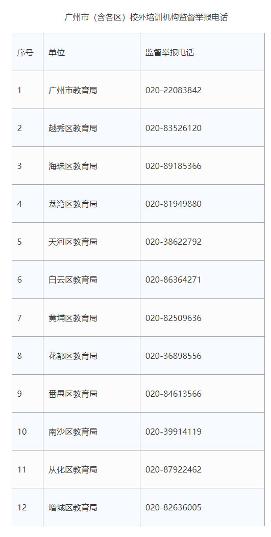 同时,广州市教育局还公布了各区校外培训机构监督举报电话。