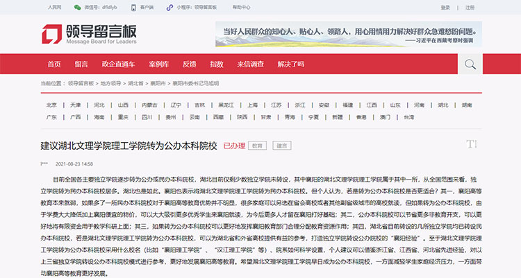 近日,有网友在人民网领导留言板“建议湖北文理学院理工学院转为公办本科院校”。对此,襄阳市教育局做出回复。