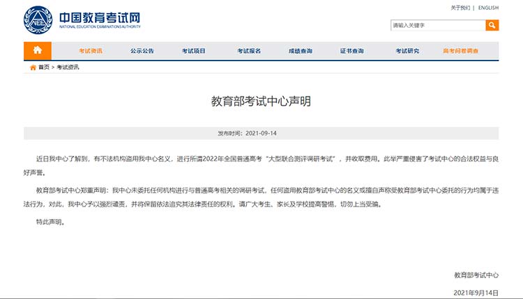 教育部考试中心9月14日发布声明称,近日该中心了解到,有不法机构盗用该中心名义,进行所谓2022年全国普通高考“大型联合测评调研考试”,并收取费用。此举严重侵害了考试中心的合法权益与良好声誉。