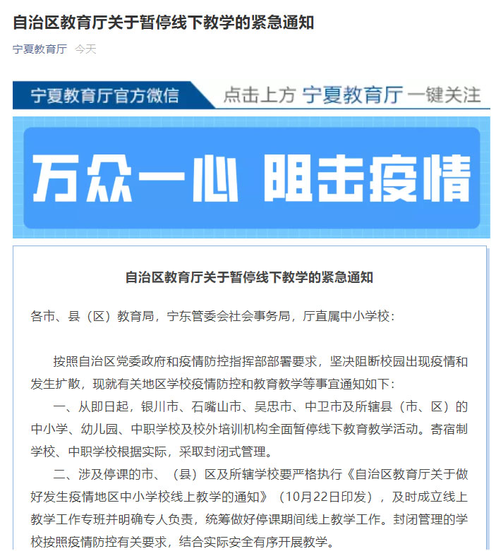 11月1日,宁夏自治区教育厅发布紧急通知,要求从即日起,银川市、石嘴山市、吴忠市、中卫市及所辖县(市、区)的中小学、幼儿园、中职学校及校外培训机构全面暂停线下教育教学活动。寄宿制学校、中职学校根据实际,采取封闭式管理。