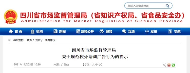 为深入贯彻落实中共中央办公厅、国务院办公厅《关于进一步减轻义务教育阶段学生作业负担和校外培训负担的意见》,坚决遏制校外培训广告突出问题,依据《中华人民共和国广告法》《中华人民共和国未成年人保护法》等法律法规规定,四川省市场监督管理局作如下提示: