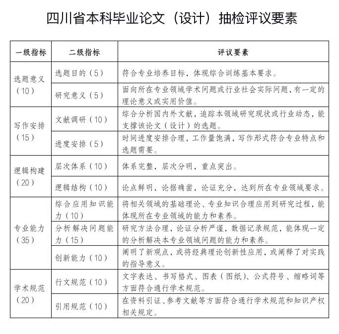 第六条 教育厅根据本科毕业论文抽检重点,对有毕业论文要求的本科专业,制定《四川省本科毕业论文(设计)抽检评议要素》。评议专家按照《普通高等学校本科专业类教学质量国家标准》要求,结合评议要素进行评议。其他形式的毕业论文(如毕业设计、毕业作品、发明、专利、毕业实习报告、案例分析、调查报告、研究报告、实践报告、设计策划方案、创作作品等),评议专家参照《普通高等学校本科专业类教学质量国家标准》要求,参考评议要素进行评议。