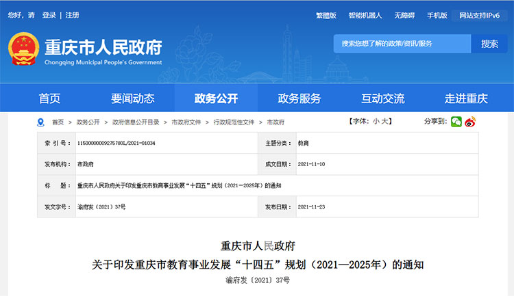 近日,重庆市政府印发《重庆市教育事业发展“十四五”规划(2021—2025年)》。其中提到,加大“双一流”高校建设力度,持续支持重庆大学、西南大学在多领域建设世界一流学科,全面提升学校综合实力和国际竞争力。重点支持西南政法大学、重庆医科大学、重庆师范大学、重庆邮电大学、重庆交通大学、四川美术学院、陆军军医大学等高校加强优势特色学科建设,力争建成国家一流学科建设高校。