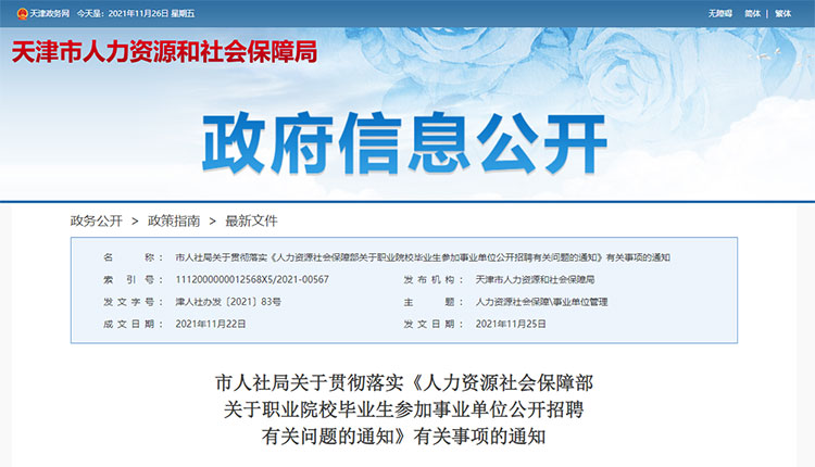 近日,天津市人力社保局发布关于贯彻落实《人力资源社会保障部关于职业院校毕业生参加事业单位公开招聘有关问题的通知》有关事项的通知。明确提出,招聘单位在设置岗位专业条件时,除参考高等学校专业目录外,应根据招聘岗位工作职责及实际用人需要,将职业教育、技工院校专业目录一并纳入参考范围。在应聘人员符合专业等其他条件的前提下,将技工院校预备技师(技师)班毕业生与大学本科学历人员同等对待,将高级工班毕业生与大学专科学历人员同等对待。