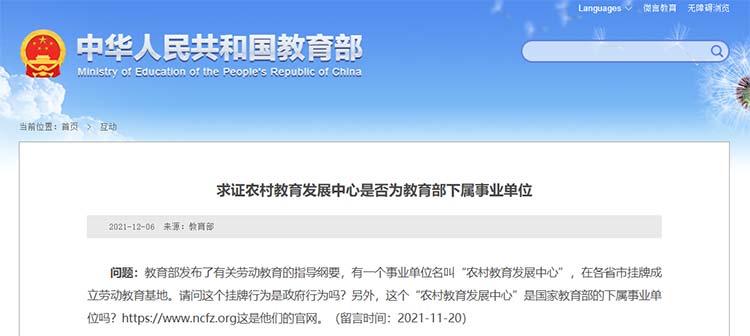 问题:教育部发布了有关劳动教育的指导纲要,有一个事业单位名叫“农村教育发展中心”,在各省市挂牌成立劳动教育基地。请问这个挂牌行为是政府行为吗?另外,这个“农村教育发展中心”是国家教育部的下属事业单位吗?https://www.ncfz.org这是他们的官网。(留言时间:2021-11-20)