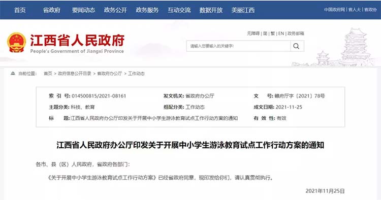 近日,江西印发《关于开展中小学生游泳教育试点工作行动方案》(以下简称《方案》)。提出,从2022年开始启动游泳教育试点,到2027年,全省中小学全面开展游泳教育。在条件成熟时,各地要将游泳纳入中考体育选考科目,并作为学生综合素质评价重要内容。