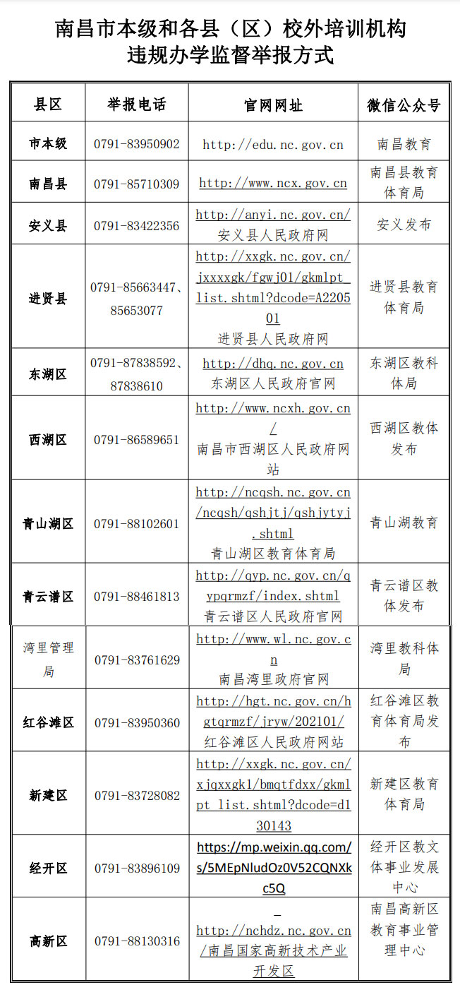 12月2日,南昌市本级和各县(区)校外培训机构违规办学监督举报方式公布。