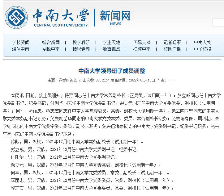 中南大学新闻网消息,接上级通知,陈翔同志任中南大学常务副校长(正局级,试用期一年);彭立威同志任中南大学党委副书记、纪委书记;付刚华同志任中南大学党委副书记;柴立元同志任中南大学党委常委、副校长(试用期一年);何军、蒋丽忠、黎志宏同志任中南大学党委委员、常委、副校长(试用期一年)。