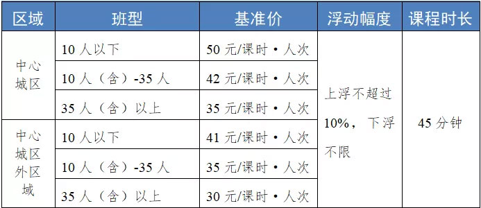 各培训机构在基准收费标准和浮动幅度内,确定具体收费标准。其中:45分钟为标准课程时长,实际时长不一样的,按比例折算。