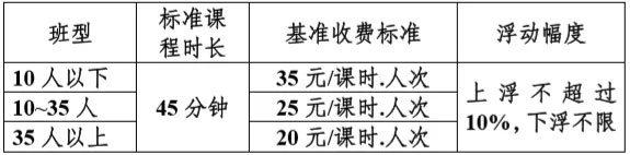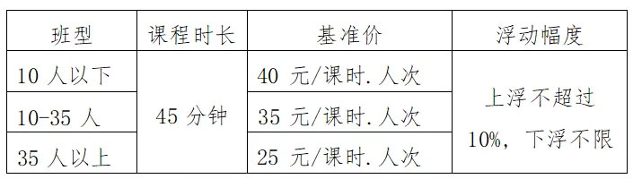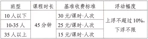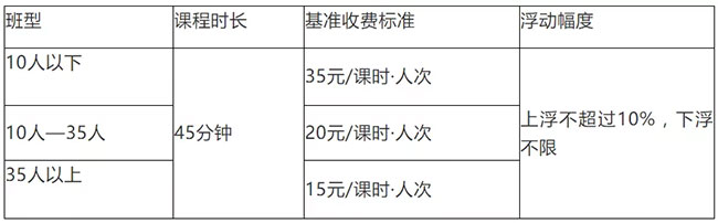 1-9人(含)班型38元/课时·人次;10-35人(含)班型25元/课时·人次;36人(含)及以上班型为15元/课时·人次。各培训机构在基准收费标准上可根据实际情况在浮动幅度(上浮不超过10%、下浮不限)内确定具体收费标准。每课时45分钟,实际时长不一样的,收费按比例折算。