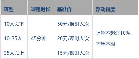班型10人以下30元/课时·人,班型10-35人20/元课时·人,班型35人以上15/元课时·人。浮动幅度,上浮不得超过10%,下浮不限。线下标准课程时长为45分钟,实际时长不一样的,按比例折算。