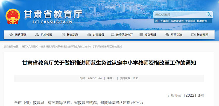 近日,甘肃省教育厅发布《关于做好推进师范生免试认定中小学教师资格改革工作的通知》。其中明确,甘肃省为2017年及以前加入国家中小学教师资格考试改革试点的省份,省内有关高等学校相关师范类专业,自2022年起可以参加免试认定改革。