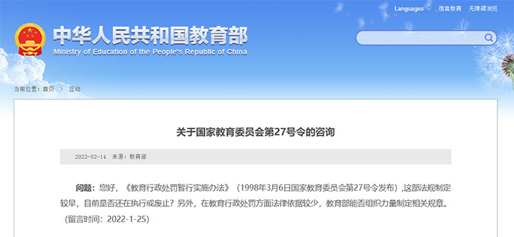 问题:您好,《教育行政处罚暂行实施办法》(1998年3月6日国家教育委员会第27号令发布),这部法规制定较早,目前是否还在执行或废止?另外,在教育行政处罚方面法律依据较少,教育部能否组织力量制定相关规章。(留言时间:2022-1-25)
