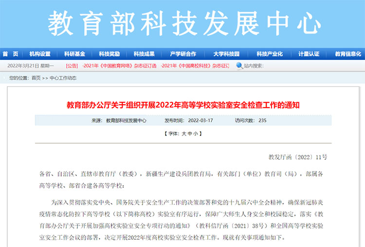 为确保新冠肺炎疫情常态化防控下高校实验室有序运行,保障广大师生人身安全和校园稳定,教育部科技发展中心近日发布《关于组织开展2022年高等学校实验室安全检查工作的通知》,本年度高校实验室安全检查工作正式启动。