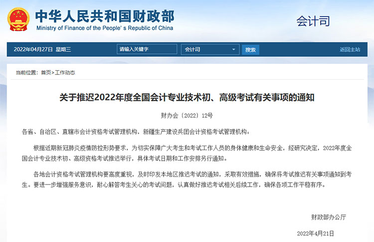 2022年度全国会计专业技术初、高级考试推迟举行