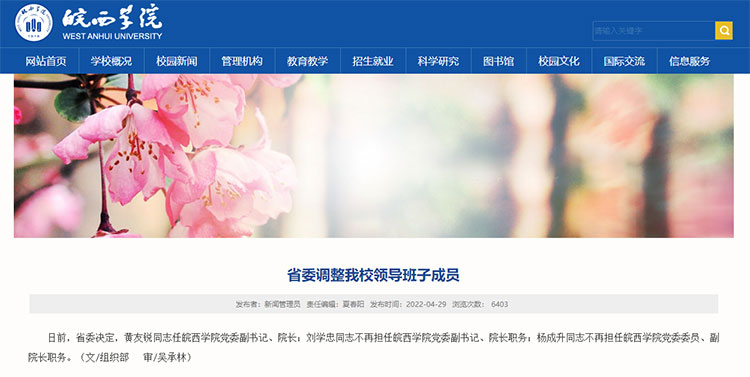 据皖西学院官网消息,日前,省委决定,黄友锐同志任皖西学院党委副书记、院长;刘学忠同志不再担任皖西学院党委副书记、院长职务;杨成升同志不再担任皖西学院党委委员、副院长职务。