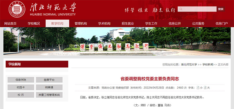 淮北师范大学官网消息,日前,省委决定,张立驰同志任淮北师范大学党委书记,陈士夫同志不再担任淮北师范大学党委书记职务。