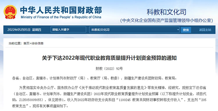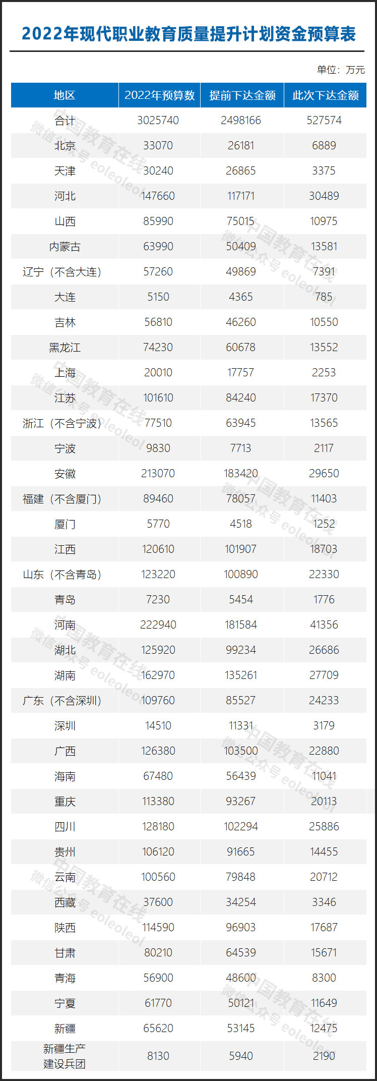 近日,财政部、教育部发布《关于下达2022年现代职业教育质量提升计划资金预算的通知》(以下简称“通知”)。此次下达的2022年现代职业教育质量提升计划资金预算金额为52.76亿元,加上已提前下达金额249.81亿元,目前累计下达预算为302.57亿元。