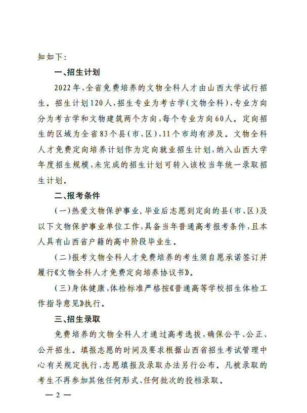 2022年,文物全科人才由山西大学招生,招生计划120人,招生专业为考古学(文物全科),专业方向分为考古学和文物建筑两个方向,每个专业方向60人,招生区域覆盖全省11个市,83个县(市、区)。免费培养的文物全科人才通过高考选拔,确保公平、公正、公开招生。