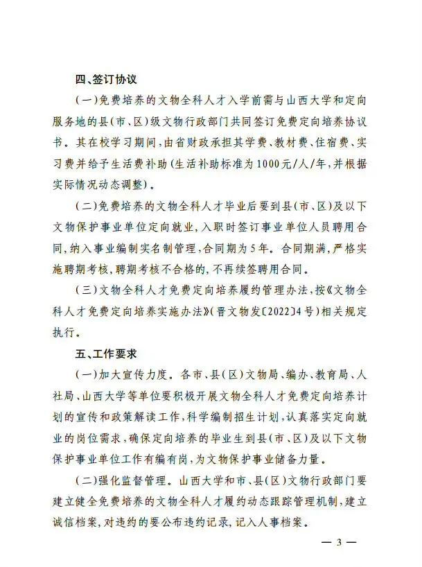 每年面向山西全省117个县(市、区)定向招生,根据各县(市、区)编制情况确定招生数量;文物全科人才毕业后直接到县(市、区)及以下文物保护事业单位定向就业,入职后直接为事业编制;在校期间学习和部分生活费用由省财政负担,列入培养院校年度预算予以保障。