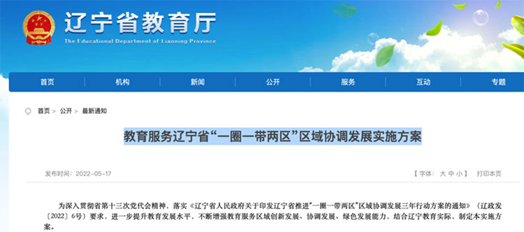 为深入贯彻省第十三次党代会精神,落实《辽宁省人民政府关于印发辽宁省推进“一圈一带两区”区域协调发展三年行动方案的通知》(辽政发〔2022〕6号)要求,进一步提升教育发展水平,不断增强教育服务区域创新发展、协调发展、绿色发展能力,结合辽宁教育实际,制定本实施方案。