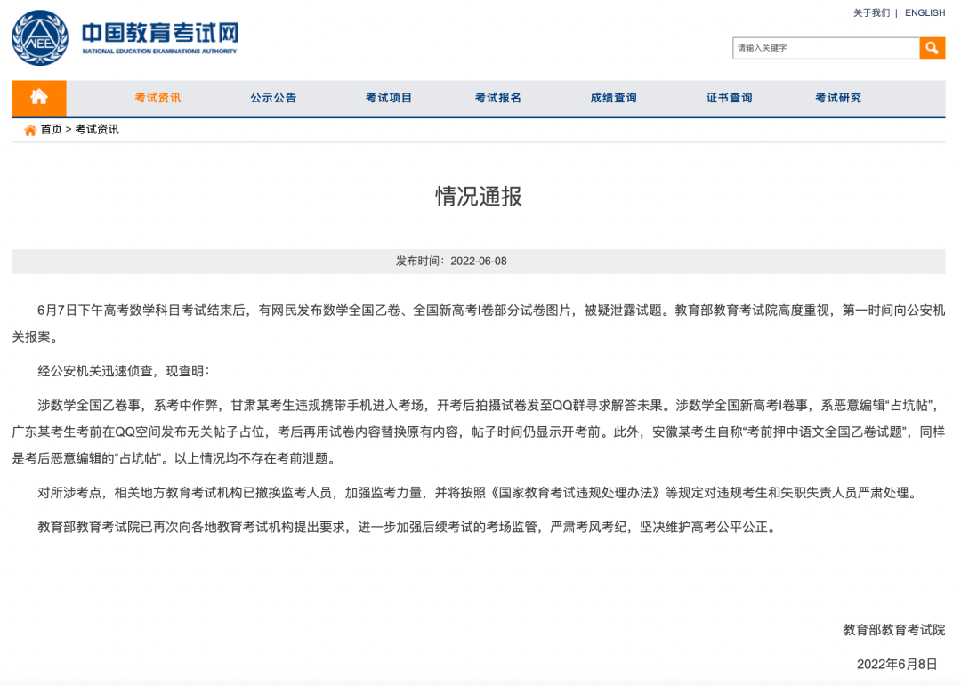 涉数学全国乙卷事,系考中作弊,甘肃某考生违规携带手机进入考场,开考后拍摄试卷发至QQ群寻求解答未果。涉数学全国新高考I卷事,系恶意编辑“占坑帖”,广东某考生考前在QQ空间发布无关帖子占位,考后再用试卷内容替换原有内容,帖子时间仍显示开考前。此外,安徽某考生自称“考前押中语文全国乙卷试题”,同样是考后恶意编辑的“占坑帖”。以上情况均不存在考前泄题。