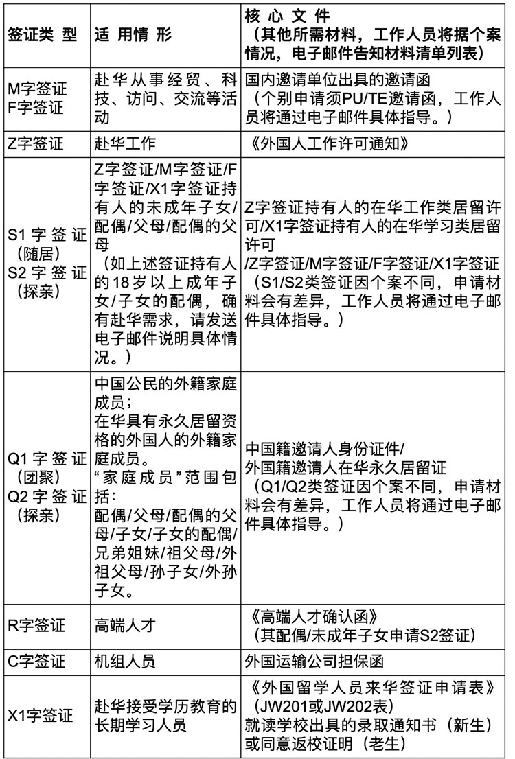 三、当前可受理签证类型和核心文件: