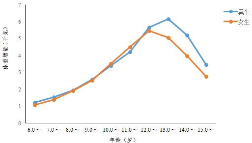 图2 十年来监测地区6~15岁各年龄段学生平均体重增量
