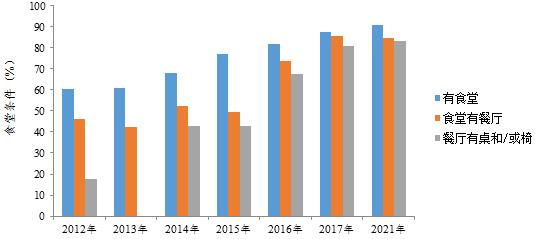 营养改善计划实施过程中,各地不断加大食堂建设力度,为推进食堂供餐提供保障。2021年,在11857所监测学校中,90.9%的监测学校有食堂,食堂有餐厅的比例为84.4%,餐厅有餐桌、椅凳的比例为83.1%。监测结果显示,监测学校中有食堂的比例逐年增高,从2012年的60.6%增长到2021年的90.9%。