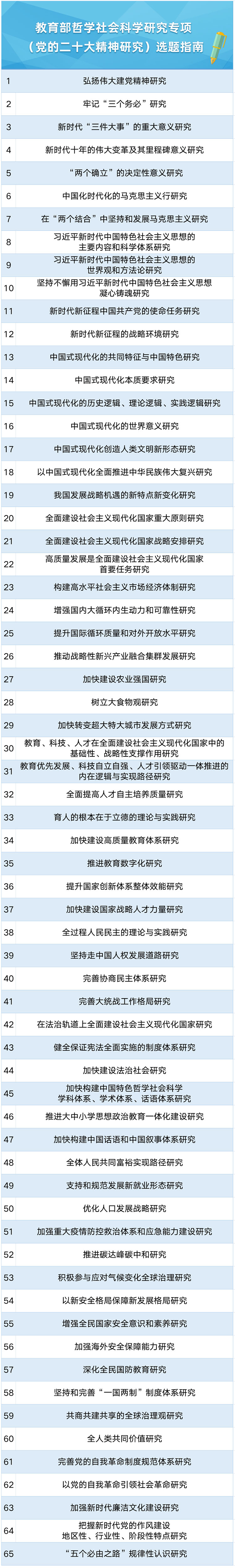 近日,教育部哲学社会科学研究专项(党的二十大精神研究)选题指南发布,本次共设立65个研究选题指南。