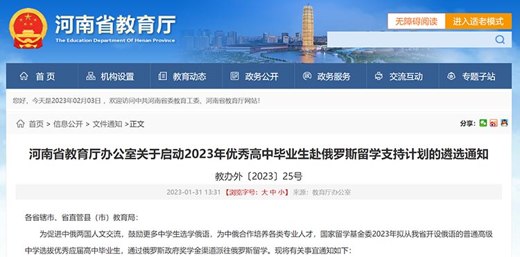 1月31日,河南省教育厅发布《关于启动2023年优秀高中毕业生赴俄罗斯留学支持计划的遴选通知》。为促进中俄两国人文交流,鼓励更多中学生选学俄语,为中俄合作培养各类专业人才,国家留学基金委2023年拟从河南省开设俄语的普通高级中学选拔优秀应届高中毕业生,通过俄罗斯政府奖学金渠道派往俄罗斯留学。留学人员享受俄方提供的政府奖学金(俄方免学费),国家留学基金委为留学人员提供互换奖学金出国留学人员补贴及一次往返国际旅费。