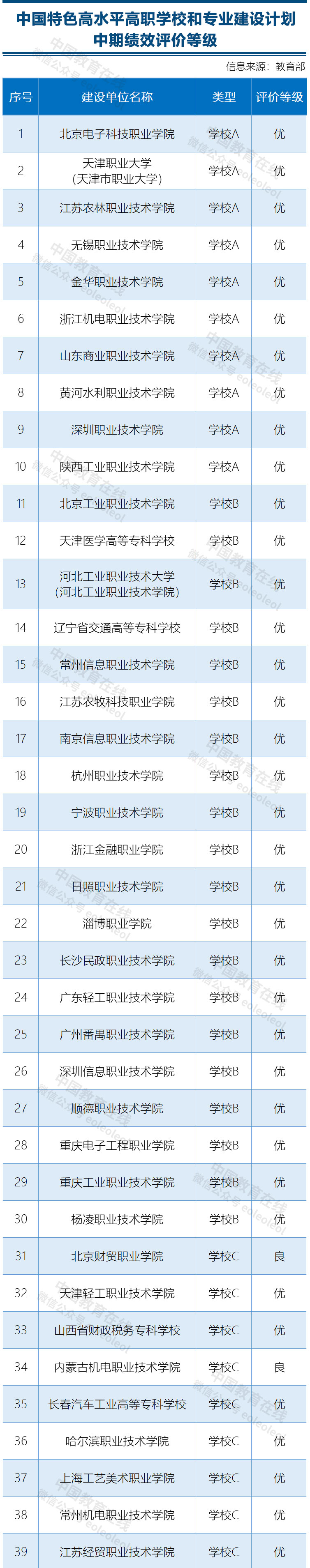 近日,教育部网站公布了中国特色高水平高职学校和专业建设计划中期绩效评价结果。根据《教育部办公厅 财政部办公厅关于开展中国特色高水平高职学校和专业建设计划中期绩效评价工作的通知》(教职成厅函〔2022〕10号)要求,经综合评议、审核公示,对中国特色高水平高职学校和专业建设计划(简称“双高计划”)中期绩效评价结果予以公布。