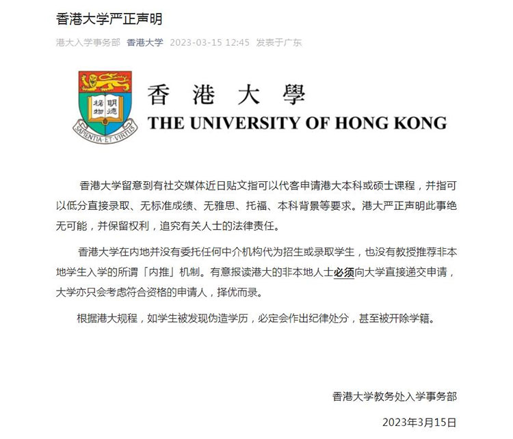 中新网3月15日电 据香港大学微信公众号消息,15日,香港大学教务处入学事务部发布声明指,香港大学留意到有社交媒体近日贴文指可以代客申请港大本科或硕士课程,并指可以低分直接录取、无标准成绩、无雅思、托福、本科背景等要求。港大严正声明此事绝无可能,并保留权利,追究有关人士的法律责任。