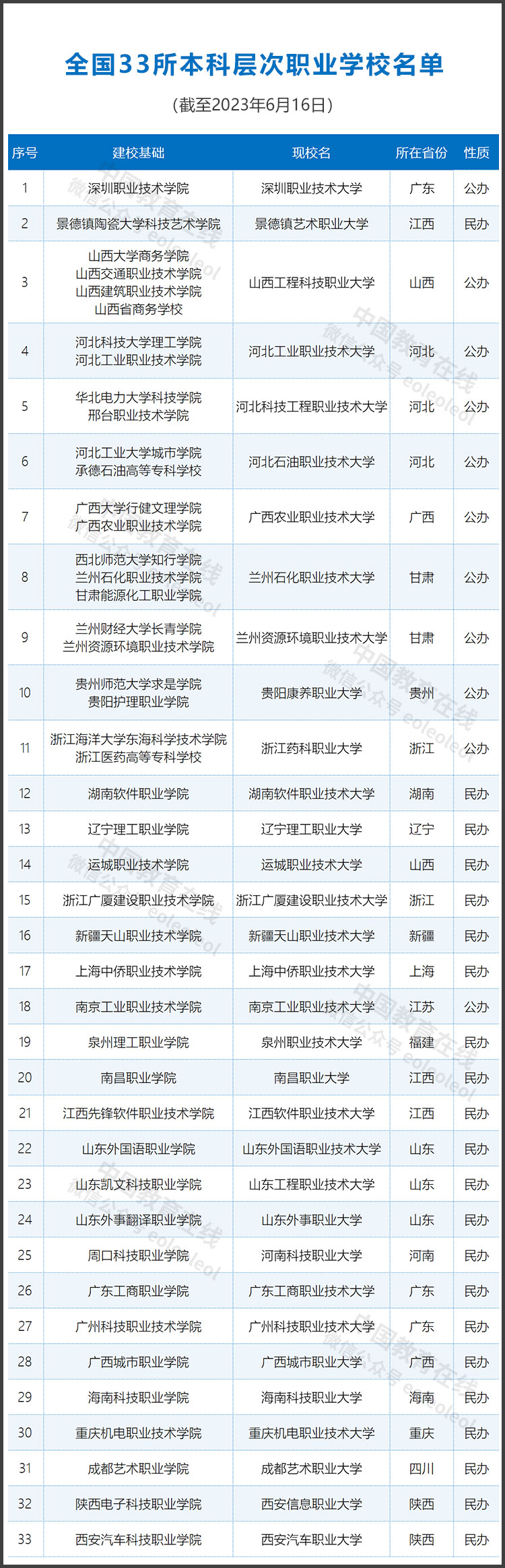 自2019年教育部批准全国首批职业本科试点大学开始,截至2023年6月,我国职业大学数量为33所。其中,民办院校22所,公办院校11所。