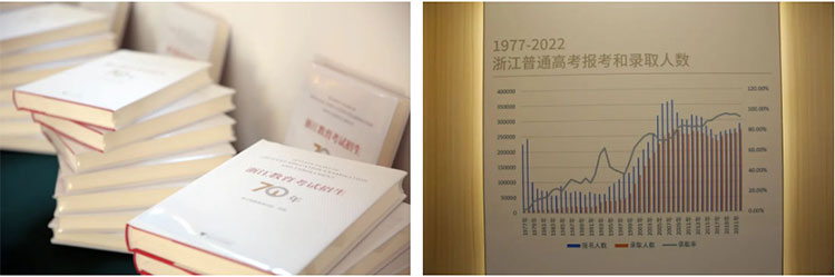 孙恒在开馆仪式上介绍,《浙江教育考试招生70年》书稿,系统梳理了新中国成立以来浙江教育考试和招生事业发展的历程。陈列馆分“领导关怀”“发展与改革巡礼”“考试管理”“科研宣传”“暖心服务”“团队建设”“机构改革”“科举史话”等8大版块,重点展现了1977年国家恢复高考制度以来全省的教育考试招生工作。二者遥相呼应、互为补充,通过图文结合、文物史料结合、场景营造、事件还原等形式,全面呈现了浙江教育考试招生事业发展图景,充分展示了浙江招考人“为党育人、为国选才”的忠诚担当和“走在前列、干在实处、勇立潮头”的精神风貌。