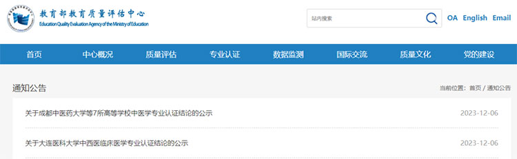教育部教育质量评估中心会同教育部高等学校中医学类专业教学指导委员会(以下简称“中医教指委”)对成都中医药大学等7所高等学校开展了中医学专业认证。按照《普通高等学校医学教育专业认证工作规程(试行)》有关要求,现将认证结论进行公示,公示时间自2023年12月6日起至12月12日止。