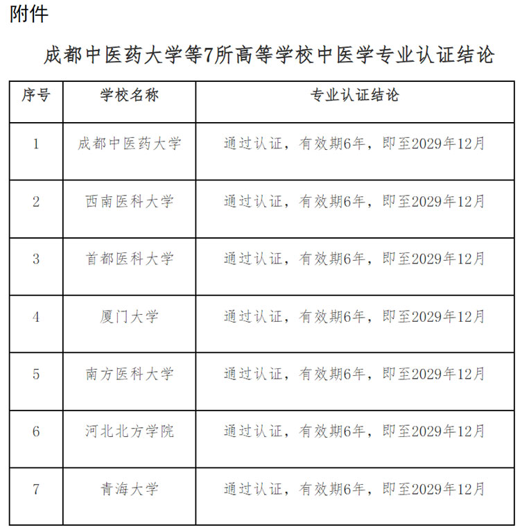 关于成都中医药大学等7所高等学校中医学专业认证结论的公示