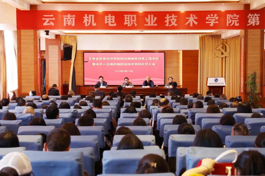 3月14日下午,云南机电职业技术学院召开云南省贸易经济学校和云南商务信息工程学校整体并入动员大会。学校党委书记赵伟出席会议并作动员讲话,云南省贸易经济学校党委书记、校长周骎,云南商务信息工程学校党委书记、校长何英作表态发言。全体校领导、中层干部,云南省贸易经济学校、云南商务信息工程学校全体教职工参会。会议由学校党委副书记、校长伍星主持。
