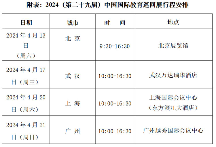 4月13日至21日,第二十九届中国国际教育巡回展将在北京、武汉、上海和广州四个城市举办。作为2024教育展的开幕活动,2024中国留学论坛将于4月12日在北京嘉里大酒店举行,论坛将以“回应挑战、共创未来:开创留学教育新格局”为主题,围绕国际化人才培养的趋势与规律、跨境教育的质量评价和学历互认、数字化国际化背景下高等教育的合作交流与制度创新等议题,邀请驻华使节代表、外国大学代表、中国大学代表、走出去企业代表和留学回国人员代表等开展研讨,凝聚共识。