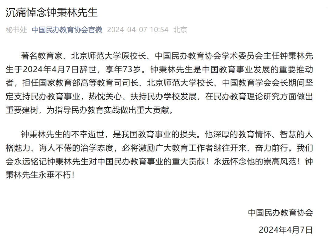 据中国民办教育协会官微,著名教育家、北京师范大学原校长、中国民办教育协会学术委员会主任钟秉林先生于2024年4月7日辞世,享年73岁。