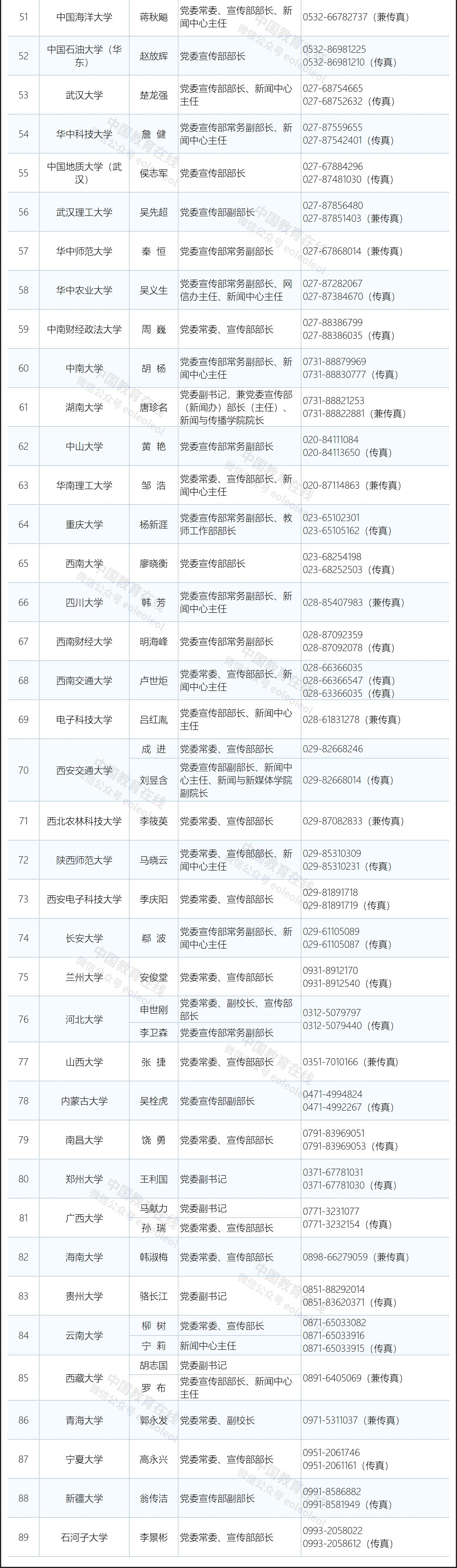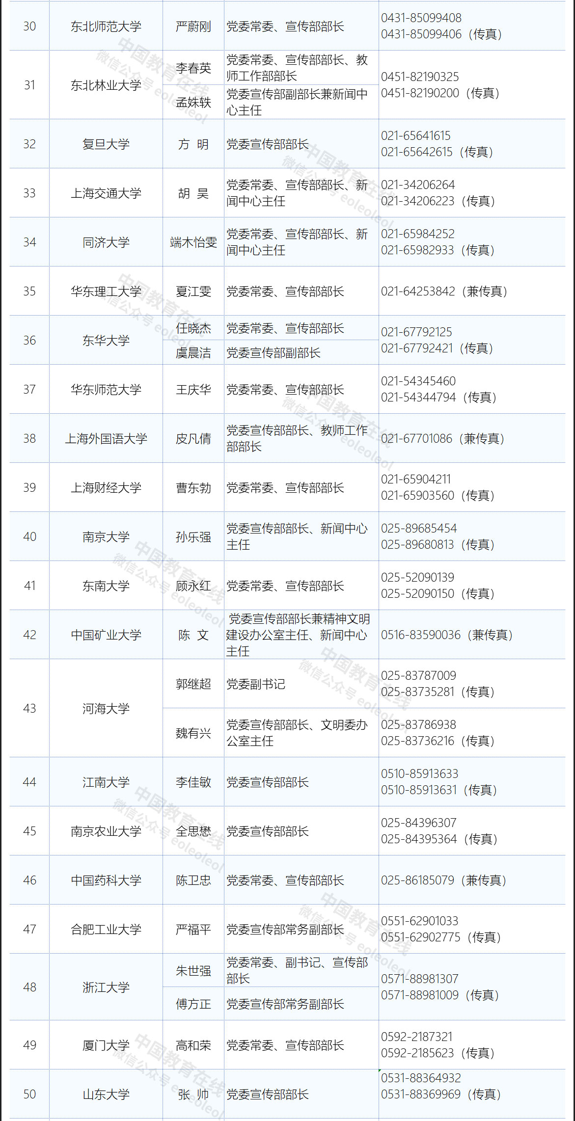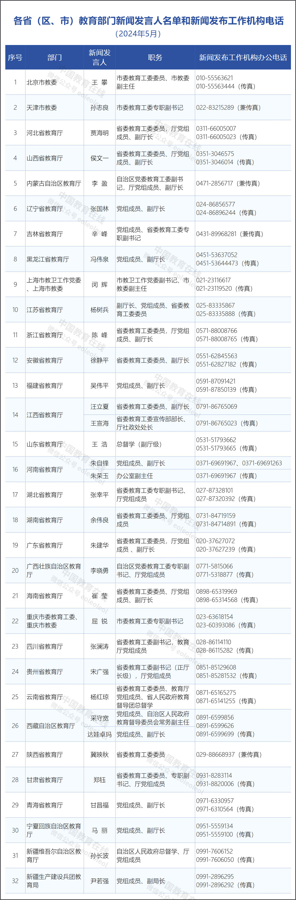 5月13日,教育部公布各省(区、市)教育部门、教育部直属高校及部省合建高校新闻发言人名单和新闻发布工作机构电话。
